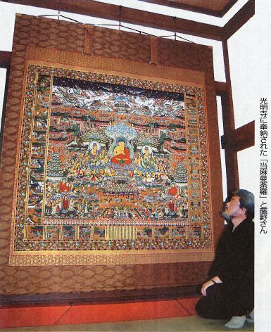 | 長岡京市の西山浄土宗総本山・光明寺でこのほど、約2メートル四方の「当麻曼荼羅(たいままんだら)」の開眼法要が営まれた。西京区在住の仏画家、藤野正観さん(56)が描き、同宗派の常念寺(愛知県一宮市)、松坂俊照住職が奉納した。藤野さんは「お経を絵にしたもの。一人でも多くの人に縁を持ってほしい」としている。 当麻曼荼羅は、極楽浄土に往生する術を分かりやすく説く図。同宗派の祖・証空上人が当麻寺(奈良県)で見て「文字で学んだことが絵で見られる」と驚いたとされる。藤野さんは「集大成」の意気で取り掛かり、江戸期の写本などを参考に彩色だけで1年半をかけた。寺では春秋の彼岸時に一般に拝んでもらうという。【鶴谷真】 毎日新聞 2006年10月29日 |